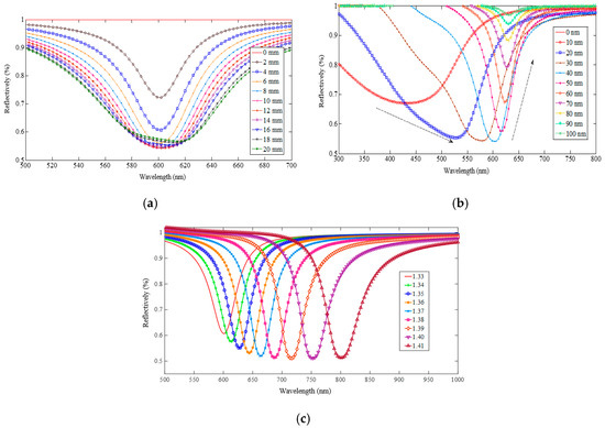 Variation of the simulated SPR spectra along with the changes of the gold film length (a), gold film thickness (b), and surrounding refractive index (c).