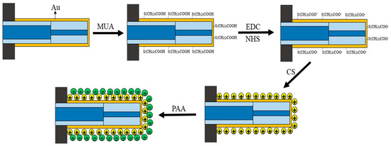 Chitosan (CS)/polyacrylic acid (PAA) was selected as the sensitive film for Hg2+ sensing. During the sensitive film coating process, the surface of the Au film was subjected to activation-COOH treatment so that the CS/PAA sensitive film was stably fixed on the Au film. As shown in Figure 5, the Au film surface activation-COOH treatment step and the CS/PAA sensitive film coating were as follows: (1) The sensor probe was thoroughly cleaned by using anhydrous ethanol and distilled water in turn; (2) the sensor probe was inserted into mercapto undecanoic acid (MUA) solution with a concentration of 50 mmol/L for one day at room temperature conditions, so the -HS in the MUA molecule combined with the Au film to form a stable Au-S bond, and the -HS and -COOH were modified on the surface of the Au film; (3) the sensor probe was immersed in a mixed solution, which consisted of 0.4 mol/L EDC (1-ethyl-(3-dimethylaminopropyl) carbodiimide hydrochloride) and 0.1 mol/L NHS (N-hydroxysuccinimide) at a ratio of 1:1 for one hour at room temperature, which activated the -COOH; (4) the sensor probe was attached to a dip coater, and then immersed in a 2% CS solution at a speed of 100 mm/min, then allowed to stand for 7 min, and finally pulled out from the CS solution at a speed of 100 mm/min, during which the -COOH on the surface of the Au film coupled with -NH2 in the CS to adsorb the CS molecule onto the Au; (5) the sensor probe was immersed in an 8% PAA solution at a speed of 100 mm/min and stand for 7 min, and then pulled out at a rate of 100 mm/min, during which the PAA solution was absorbed; (6) steps (4) and (5) were repeated until an appropriate number of layers of CS/PAA sensitive film were coated on the surface of the Au film; (7) the sensor probe coated with the sensitive film was placed in a 60 °C incubator for 12 h to completely dry the sensitive film and fix it on the probe surface.