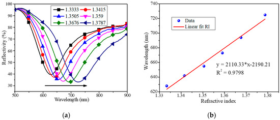 Resonant spectra (a) and linear fitting result (b) of a reflective fiber SPR sensor in refractive index measurement.