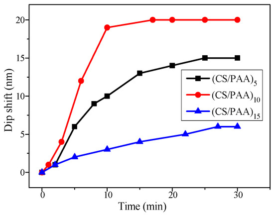 Under the same conditions, fiber reflective SPR sensors with Hg2+ sensitive films of 5 layers, 10 layers, and 15 layers were fabricated, named as (CS/PAA)5, (CS/PAA)10, and (CS/PAA)15, respectively. These fiber sensors were immersed in 50-μM Hg2+ solution, and the output spectra were recorded with the detection time, respectively, as shown in Figure 8. From the experimental results, it can be seen that with the increase of the detection time, the spectral wavelength moves to the long wavelength direction, and finally stops moving. This is because the adsorption of Hg2+ leads to an increase of the cross-linking degree and an increase of the refractive index of the sensitive film. The wavelength shifts at equilibrium are 15 nm, 20 nm, and 6 nm, respectively. When measuring the same concentration of Hg2+ solution, the (CS/PAA)10 sensor has the largest spectral wavelength shift, namely the highest sensitivity. Therefore, the optimal number of layers of the sensitive film was selected as 10 in the following experiments.