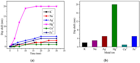 Since CS and PAA were the sensitive materials chosen in this experiment, the -NH2 and -COOH in the molecule can form chelates with most metal ions. Therefore, the sensitive film can not only adsorb Hg2+, but also other metal ions, such as K+, Na+, Cu2+, Ag+, and Fe3+. In order to investigate the specificity of the fiber SPR Hg2+ sensor, K+, Na+, Cu2+, Ag+, and Fe3+ solutions with an ion concentration of 50 μM were prepared, and then solutions containing different ions with the same concentration were measured by the SPR sensor. The experimental results are shown in Figure 10. As can be seen from Figure 10a, with the increase of the detection time, the wavelength shift increases gradually with the detection time, and finally reaches stability. It can be seen from Figure 10b that the stable wavelength shift of Hg2+ is obviously larger than that of the other ions. Therefore, this proposed SPR sensor shows good specificity to Hg2+.