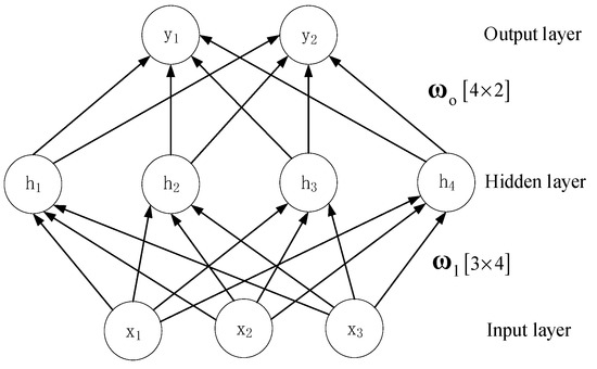 A neural network generally consists of three layers: An input layer, a hidden layer, and an output layer. As shown in Figure 1, it is a simple neural network with three inputs and two outputs and four neurons in a single hidden layer. The neurons between layers are connected by weight . The DNN contains multiple hidden layers, which has a significant improvement in the nonlinear fitting ability of the DNN compared with the single hidden layer. However, too many hidden layers are likely to cause over-fitting. The learning process of the network is the process of adjusting and determining the connection weights of each neuron through training samples.