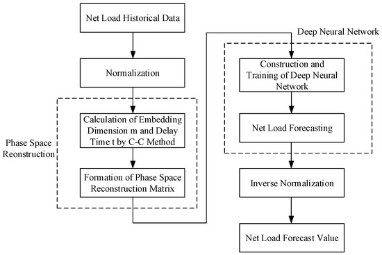 Since traditional load data are typically in hours as the smallest unit, short-term and ultrashort-term forecasts are often not strictly distinguished. With the large-scale access of distributed PV, the short-term load forecasting usually in hours cannot satisfy the requirements of the real-time safety analysis. For the real-time safety analysis of power systems and the reliable operation of economic dispatch, a more detailed ultrashort-term prediction is required. Considering the volatility of the distributed PV power generation and the real-time requirements of the ultrashort-term prediction, the PV power should also be considered a load and merged with the traditional load to form a net load [20,21,22]. Because the net load is a set of nonlinear time series with large volatility, in this paper, the phase space reconstruction of net load data is first performed to project the data into the moving point with certain regularity of the trajectory in the phase space. Then, the excellent nonlinear fitting ability of the deep neural network is used to fit the moving point trajectory to obtain the final prediction value. Finally, the actually measured load data is applied to verify the prediction effectiveness and prediction effect of the model under different weather conditions. The phase space is a tool to feature a dynamic system that is reconstructed from a univariate or multivariate time series [23], which is widely used in forecasting models. The DNN is the development of the traditional ANN and suitable for net load forecasting because the nonlinear fitting ability is strengthened [24]. The high accuracy in forecasting the net load under high PV penetration rate and different weather conditions is verified using real data. The contribution of this paper can be summarized as follows: