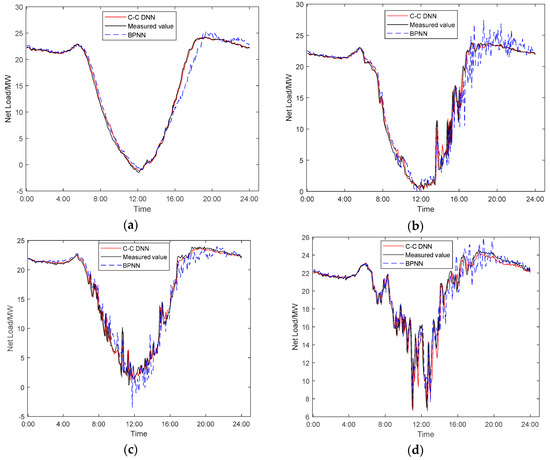 In Figure 5, at approximately 12:00 noon on a clear day (12th), a negative power was present in the payload due to an increase in the amount of PV power generation. The prediction results based on the phase space reconstruction and DNN were closer to the actual net load value, which was obviously better than the prediction results using the traditional BP neural network.