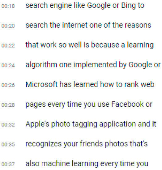 Figure 1 shows that company names such as Google (00:24), Microsoft (00:26), Facebook (00:28), and Apple (00:32) are written in capital letters. However, some people did not capitalize the first letters due to the nature of their own subtitles, so we converted the whole data to lower case. Also, if you do not do lowercase conversion, word embedding recognizes “Google” and “google” as different words.