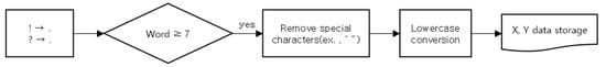 Figure 2 is a flowchart showing the preprocessing of this study. First, the exclamation mark (!) and the question mark (?) are changed to a period (.) mark to indicate the end of the sentence. After that, sentences with less than 7 words ended by the period are excluded from the data, which means the minimum length required for learning. The eliminated sentences include sentences consisting mainly of simple greetings or nouns. Automatically generated subtitles do not have apostrophes (‘) or other punctuation. Therefore, only the period position of the actual subtitle is stored as a reference, and all remaining punctuation marks, such as commas (,), double quotation marks (“ ”), and single quotation marks (‘ ’), are removed.