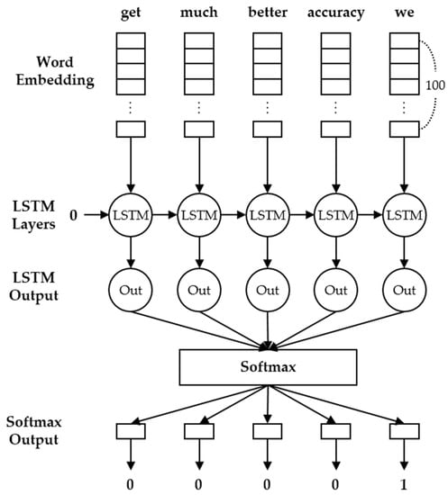 Figure 3 shows how data are processed in the program. The five words in Figure 3 are taken from the second example in Table 2. First, all words get vector values of 100 dimensions through word embedding using Word2Vec. These vector values also contain information about the position of the period. Second, the words that have been converted to vectors enter the LSTM layer and this output is calculated while being affected by the previous output. Finally, these outputs predict that a period must be generated between the “accuracy” and “we” by softmax function.