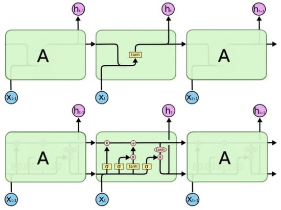 As shown in Figure 4, LSTM solved the vanishing gradient problem by adding an input gate, a forget gate, and an output gate to each path that compute the data in the structure of the basic RNN. These three gates determine what existing information in the cell will be discarded, whether to store new information, and what output value to generate.