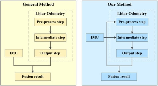 A typical lidar odometry algorithm can be roughly divided into three steps: a pre-processing step, an intermediate step, and an output step. Most existing lidar/Inertial Measurement Unit (IMU) fusion approaches try to fuse lidar odometry and the IMU in the output level [2,3,4,5,6,7]. In this paper, we try to utilize the IMU information in all the three steps.