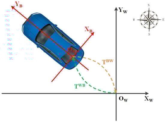 Figure 2 shows the coordinate system and in the 2D plane and the relationship between them. The body coordinate system changes with the movement of the vehicle. represents the transformation between the coordinate system and at time , which can also denote the pose of the vehicle at time . On the contrary, transforms the coordinate system to and . Moreover, , which could be obtained from the IMU, represents the relative transformation of the vehicle between time and . The relationship between and can be expressed as: