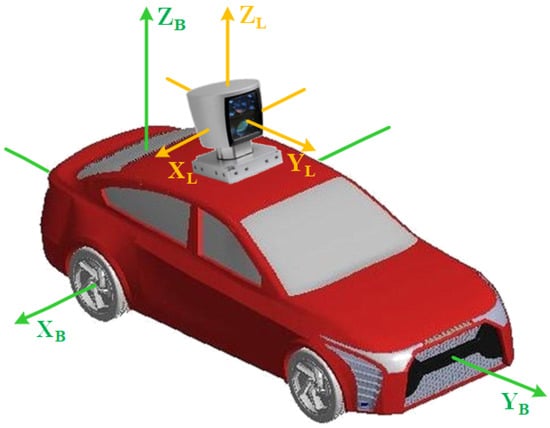 The calculation of the relative transformation between and is a typical hand–eye calibration problem. Based on , we can transform a point from the lidar coordinate system to the body coordinate system :