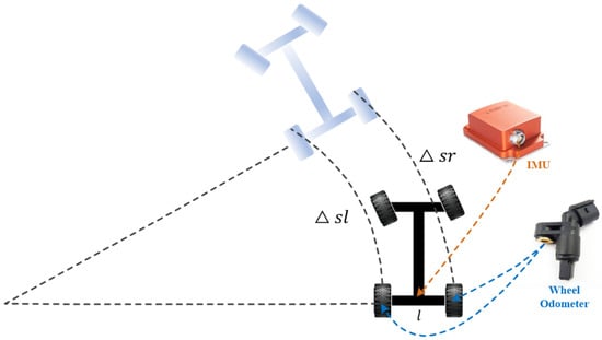 The motion model of the vehicle can be simplified as Figure 4. We mount the IMU at the center of two rear wheels, and mount two wheel encoders on the left and right rear wheels, respectively. The black car denotes the position of the vehicle at the previous moment , and the blue car indicates its position at the current time . and represent the traveled distances of the left rear wheel and the right rear wheel during the short period of time.