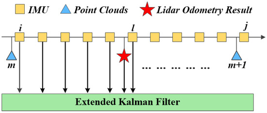 In this section, We use an EKF framework to fuse the IMU and the results obtained from the lidar odometry, as shown in Figure 5. Let the motion prior model presented in Section 3.2 be the system model and the results from the lidar odometry (which is denoted as the red star in Figure 5) be the measurements. The system model and measurement model are described as follows.