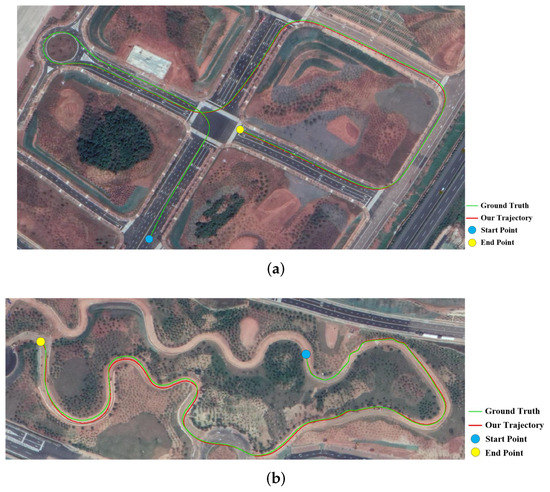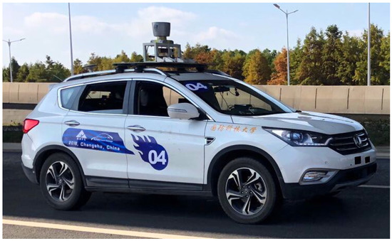 The platform used in the following experiments is shown in Figure 6. The vehicle is equipped with a Velodyne HDL-64E lidar, a Xsens MTI300 IMU, two photoelectric encoders, a NovAtel SPAN-CPT GNSS/INS system, and a Nova 5100 industrial computer. The lidar is mounted on the top of the car, and it has 64 beams which could generate over 1.3 million points per second with a high range accuracy. The horizontal Field of View (FOV) is , the vertical FOV is , and the maximal detection distance is 120 m. The NovAtel GNSS/INS system provides localization results with centimeter-level accuracy, which can be served as the ground truth.