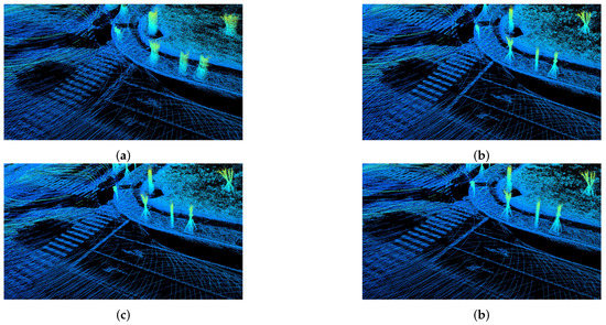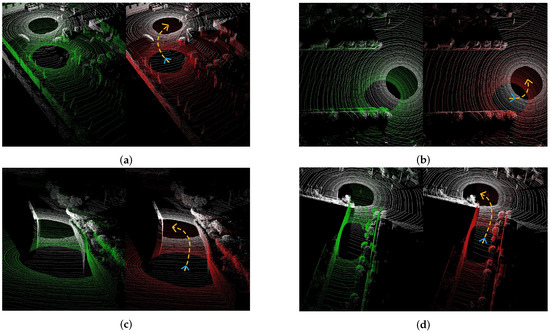 We choose the frame pairs before and after the vehicle makes a turn. In addition, all the frames are collected when the vehicle is stationary. Figure 7 shows several transformation pairs we have chosen. In each sub-figure, the left part is the registration result before the hand–eye calibration, whilst the right half is the result after hand–eye calibration. It can be seen that and are much better-registered in the right half of Figure 7a–d than the left half, which indicates the importance of hand–eye calibration.