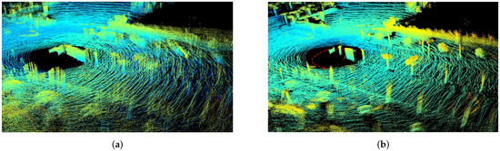 As mentioned in Section 3.1, it usually takes 100 ms for the lidar to spin a full circle. During this time, the vehicle also keeps moving. Some of these data are received at the previous moment and their coordinates are represented in the coordinate system corresponding to the moment . These points can be denoted as . If we want to represent these points in the coordinate system corresponding to time , we need to transform the point to . This transformation is usually called “correction” or “rectification” of the lidar scan.