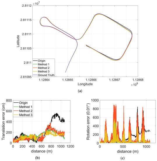 To quantitatively test the effect of intra-frame correction, LOAM is also used as the lidar odometry algorithm, and the localization accuracy is compared with the ground-truth trajectory. Figure 11 compares the localization results with/without rectification. The trajectories generated by the three rectification methods and without rectification are compared with the ground truth in Figure 11a, where “Method 1” represents rectification by previous registration, “Method 2” is the approach of registering two distorted point clouds, and “Method 3” indicates rectification by IMU data. In addition, Figure 11b,c compare the translation error and rotation error of these approaches.