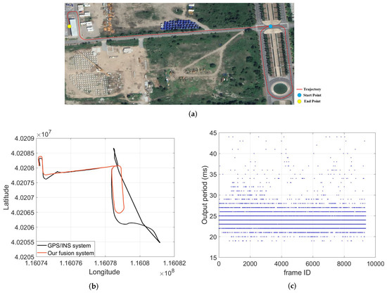 The results in a GNSS-deniedenvironment. (a) shows the trajectory generated by our system when the UGV drives at a speed around 20 km/h and the overall distance is about 1.3 km. (b) compares the trajectories generated by our system and by the disturbed GNSS/INS system. (c) shows the output period of our localization system during the whole process, and the average output frequency is about 39.7 Hz.