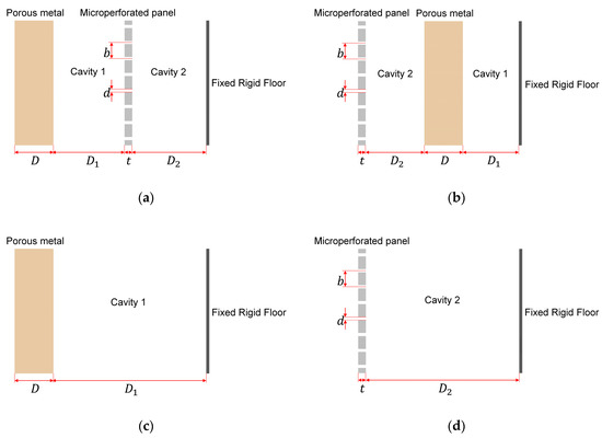 Schematic diagrams of the investigated sound absorbing structures. (a) Porous metal + cavity + microperforated panel + cavity; (b) Microperforated panel + cavity + porous metal + cavity; (c) Porous metal + cavity; (d) Microperforated panel + cavity.