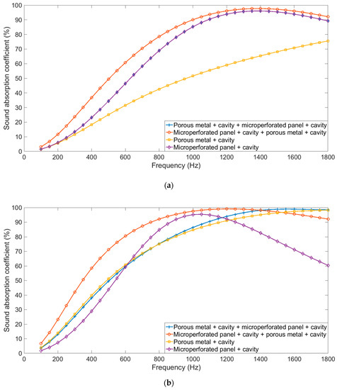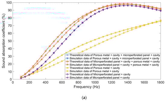 (1) The optimal combination structure of microperforated panel + cavity + porous metal + cavity was a valuable low frequency sound absorber, and its actual average sound absorption coefficient in the low frequency range of 100–1800 Hz reached 62.9615% and 73.5923%, respectively, when the limited total thickness was 30 mm and 50 mm.