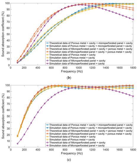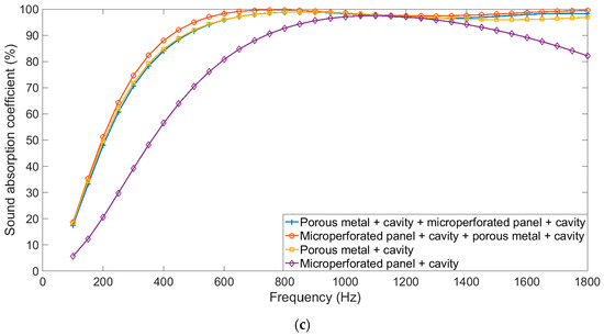 The theoretical sound absorption coefficients of the investigated sound absorbers are summarized in Figure 2a–c, which correspond to the limited total thicknesses of 30 mm, 50 mm, and 100 mm, respectively. It can be observed from Figure 2a that when the limited total thickness was 30 mm, the sound absorption coefficients of the sound absorber consisting of microperforated panel + cavity + porous metal + cavity were completely consistent with those of the sound absorber consisting of microperforated panel + cavity because the obtained optimal structural parameters for these two sound absorbers are the same in Table 1. It can also be observed that the sound absorption coefficients of the porous metal were significantly determined by its thickness. The larger the thickness, the better its sound absorption performance, which is consistent with the normal sound absorption principle of porous material [7,13,28]. Meanwhile, it can be seen from Figure 2c that when the limited total thickness reached 100 mm, with the exception of the sound absorber consisting of microperforated panel + cavity, all sound absorbers achieved a similar sound absorption performance, which is consistent with the results in Table 3.