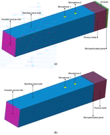 According to the theoretical optimal structural parameters obtained by Cuckoo search algorithm, the finite element simulation models for the four investigated sound absorbers were constructed in the virtual acoustic laboratory, and schematic diagrams of the simulation models when the total thickness was 50 mm are shown in Figure 3. The plane wave was introduced in the acoustic source inlet, which was treated as the incident sound source. Two microphones were utilized to measure the incident sound wave and the reflected sound wave in the standing wave tube, which were used to calculate the sound absorption coefficient. In the model, porous metal was characterized by setting its structural parameters, which included the static flow resistivity, porosity, bulk density, specific heat ratio, and so on. Meanwhile, the microperforated panel was represented by the acoustic transfer relation admittance loading at the inner surface and outer surface of the panel. Dimensional parameters of the porous metal, microperforated panel, and the cavity were coincident with the obtained optimal parameters in Table 2. In this way, the real part and imaginary part of the sound pressure at microphone 1 and those at microphone 2 could be obtained from the simulation process and exported as the original data, and the sound absorption coefficient could be calculated.