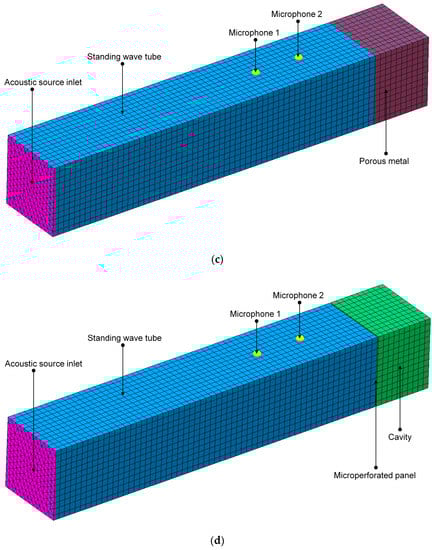 The finite element simulation models for sound absorbers constructed in the virtual acoustic laboratory. (a) Porous metal + cavity + microperforated panel + cavity; (b) Microperforated panel + cavity + porous metal + cavity; (c) Porous metal + cavity; (d) Microperforated panel + cavity.