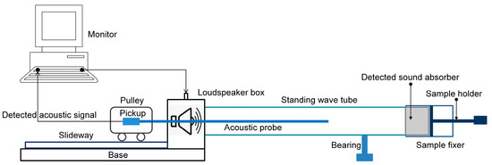 Although the average sound absorption coefficient of the sound absorber increases along with an increase in the limited total thickness, the increase in the dimensional size of the sound absorber would require more installation space, which might limit its practical application. Moreover, the larger the sound absorber, the higher its fabrication cost. Therefore, experimental validations of the optimal sound absorbers when the limited total thickness was 30 mm and 50 mm were conducted with an AWA6128A detector (Hangzhou Aihua Instruments Co., Ltd., Hangzhou, China) according to the standing wave method [13,27,28], and a schematic diagram of the experimental system is shown in Figure 5. The porous metal used was porous copper, which was purchased from YiYang Foammetal New Materials Co., Ltd., Yiyang, China. The microperforated panel was fabricated by the laser beam drilling of spring steel according to the optimal structural parameters in Table 1 and Table 2 [16,33]. After the required samples were prepared, they were assembled to form the desired sound absorbers investigated in this study. These sound absorbers were measured by an AWA6128A detector to obtain their sound absorption coefficients in the frequency range of 100–1800 Hz. According to the operating instruction of the AWA6128A detector, the cross-sectional shapes of the detected sound absorbers were round, and their diameters were 96 mm. Meanwhile, the measured sound frequencies were 100 Hz, 200 Hz, 300 Hz, 400 Hz, 500 Hz, 600 Hz, 700 Hz, 800 Hz, 950 Hz, 1100 Hz, 1300 Hz, 1500 Hz, and 1800 Hz, which consisted of 13 frequency points.