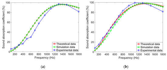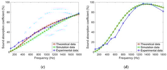 Theoretical models of the sound absorption coefficients of these sound absorbing structures were constructed through the transfer matrix method [21], as shown in Equation (1). Here, is the sound absorption coefficient; and are two components of the total transfer matrix of the sound absorber, which can be calculated through Equations (2)–(5) for the corresponding sound absorbing structures in Figure 1a–d; is the density of the air, 1.21 kg/m3; is the acoustic velocity in air, 340 m/s; and represent the real part and imaginary part of one complex number, respectively.