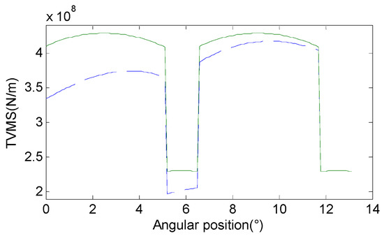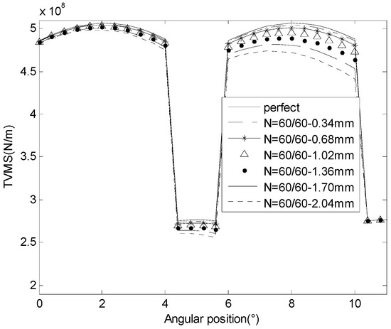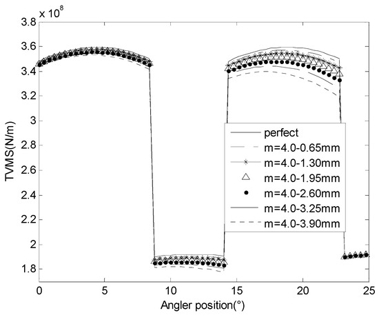 3.2. Meshing Stiffness and Vibration Response for Cracked Gears in Different Modulus
