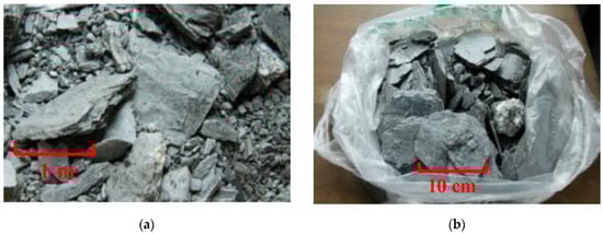 In order to gain the physical, chemical and mechanical characteristics of surrounding rock of diversion tunnel, and to provide basic parameters for the analysis of a large deformation mechanism, the optimization of tunnel excavation method, and the design and construction of the support structure, rock samples were taken from the construction site for laboratory tests (tested at the Key Laboratory of Transportation Tunnel Engineering, Ministry of Education, Southwest Jiaotong University, Chengdu, China). The test includes four aspects: mineral composition test, free expansion rate test, rock expansion pressure test, and rock mechanics test. Rock samples were taken from the site, as shown in Figure 1. The rock samples are phyllite slate.