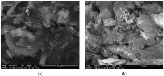 Scanning electron microscope image of rock sample: (a) magnified 3000 times; (b) magnified 10,000 times.
