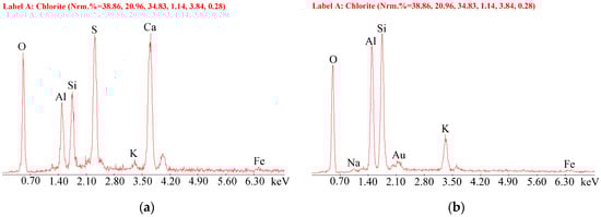 For determining the microstructure and mineral composition of rocks, scanning electron microscopy (SEM) image analysis and energy spectrum analysis of rock samples were carried out (Figure 2 and Figure 3). There are many flaky minerals with orientation and flaky minerals with a particle size of 2–5 microns. The main mineral components of the rocks are sericite, illite, montmorillonite, and gypsum.