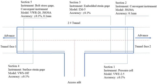 The test items include a stress test of the supporting structure (tunneling by drilling and blasting method, C25 shotcrete, Φ22 rock bolt with 5 m length, I20A steel arch, the second lining of C40 molding concrete), a contact pressure test between rock mass and initial support, and tunnel clearance deformation monitoring. The distribution position of the monitoring section in the tunnel is shown in Figure 7; the instrument arrangement positions on the monitoring section are shown in Figure 8; the test items and methods are shown in Table 2.