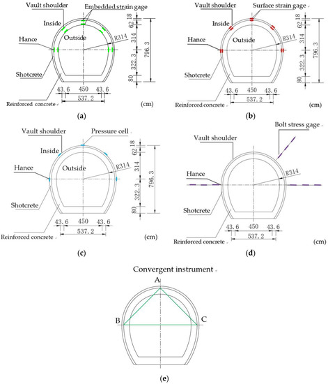 The instrument arrangement positions on monitoring section: (a) strain of second lining; (b) strain of steel arch; (c) contact pressure between rock mass and initial support; (d) bolt stress; (e) clearance convergence deformation.