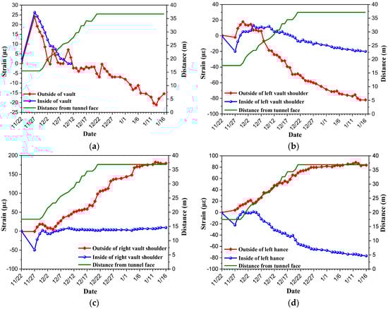 Monitoring results of the second lining strain in Section 3 are shown in Figure 9 (the monitoring element was damaged during construction, partial data of vault inside were missing). In this section, large deformation occurred shortly after the tunnel excavation, which led to the initial support intruding into the clearance, and the second lining had to be constructed after the secondary expanding excavation.