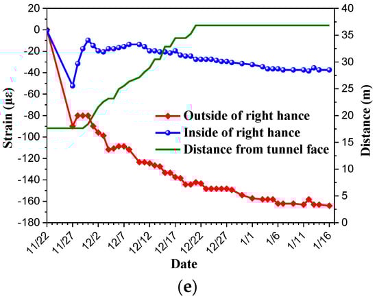 Monitoring results of second lining strain in Section 3: (a) vault; (b) left vault shoulder; (c) right vault shoulder; (d) left hance; (e) right hance.