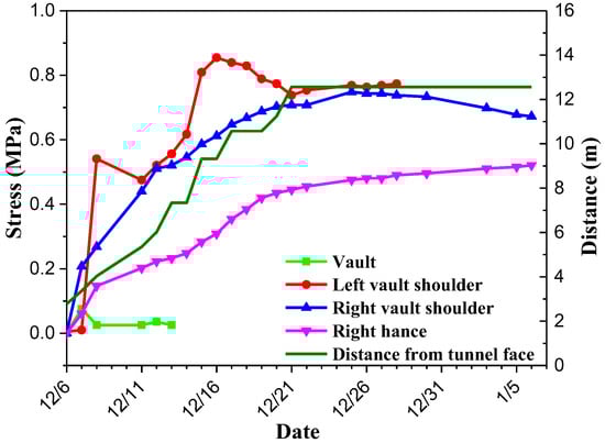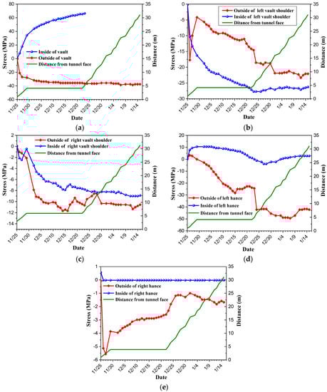 The stress of the steel arch converted from the strain obtained by monitoring is shown in Figure 10 (the monitoring element fell off during construction, and the data of right hance inside were invalid). The steel arch is subjected to compression mainly and tension partly. The maximum tensile stress was 70 MPa and the maximum compressive stress was 40 MPa, which are less than the tensile and compressive strength of the steel arch respectively. The influence of excavation on the stress of the steel arch is not obvious after the tunnel face is closed for a period of time. This is because the stress of the steel arch converges rapidly and the confining pressure is not lost. The direction of large stress is vertical, but the direction of large strain obtained in the previous section was horizontal. This phenomenon indicates that inconsistency between the direction of large stress and the direction of large strain may be due to the dilatancy effect [43]. The lithology is extremely uneven and changes frequently. The shear fracture zone and joint are developed. Based on these, under the effect of high vertical stress, the dilatancy occurs in the direction of small stress, thus the horizontal strain is much larger.