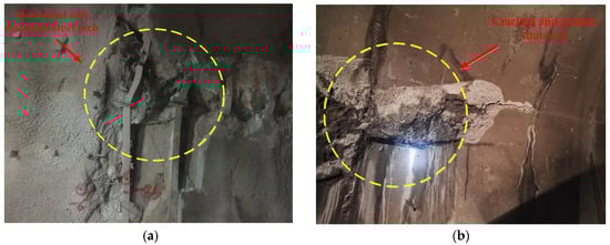 As we can see from Figure 11 (the sensor was damaged during construction, and left hance data and partial vault data were missing), the maximum contact pressure at the vault shoulder was about 0.9 MPa, which exceeds the ultimate load that the steel arch can bear. Field observation also shows that the steel arch was damaged, deformed and distorted, and the shotcrete cracked and peeled (Figure 12). The monitoring results are consistent with the field observation results. The contact pressure did not develop until the tunnel face ceased to be excavated and was sealed. The large deformation of surrounding rock is mainly caused by the advancing of the tunnel face. When large deformation occurs, the advance of a tunnel face should be stopped. The large deformation has exceeded the bearing capacity of the initial support. The second lining should be applied in time to control the rheological deformation of the surrounding rock in the later period.