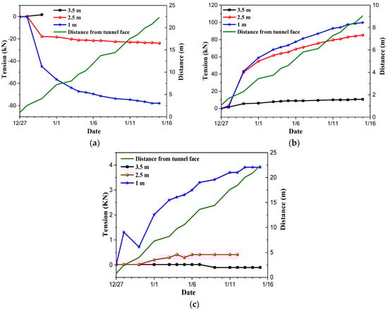Monitoring results of bolt stress in Section 5: (a) right vault shoulder; (b) left hance; (c) right hance.