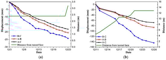 At both sections, the monitoring work continued until the construction of the second lining. It can be seen from Figure 14a that the maximum horizontal convergence was about 25 mm, and the average daily deformation value was about 1 mm. And no initial support wreck is found by field observation. As we can see from Figure 14b, the maximum horizontal convergence was about 140 mm, the average daily deformation value was about 10 mm, which is consistent with monitoring results of contact pressure between rock mass and initial support and field observation (the steel arch has been damaged, deformed and distorted, and the shotcrete has cracked and peeled).