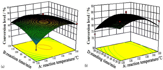 (a) Response surface diagram of the effect of reaction temperature, reaction time interaction on conversion level; (b) response surface diagram of the effect of reaction temperature, standing time interaction on conversion level.