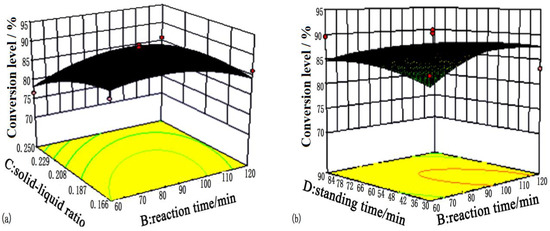 (a) Response surface diagram of the effect of solid–liquid ratio and reaction time interaction on conversion level; (b) response surface diagram of the effect of standing time and reaction time interaction on conversion level.