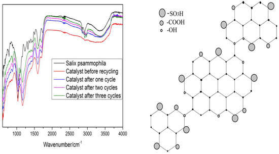 As shown, Figure 4 presents that in the infrared spectrum peak of the catalyst, the solid acid catalysts prepared by the one-step method still had a peak of 3400 cm−1 containing the associated hydroxyl group and the stretching vibration of the hydroxyl group contained in the carboxyl group; the carbonyl peak contained in the carboxyl group at 1600 cm−1; the stretching vibration peaks of SO3H and O = S = O bonds occur at about 1000 cm−1 and 1100 cm−1, respectively, demonstrating that concentrated sulfuric acid has played a role in sulfonation and the sulfonyl has been successfully introduced after the one-step method treatment of Salix psammophila. In the one-step process of concentrated sulfuric acid, the positively charged sulfonic acid group electrophilically replaced C on the fused ring structure to form a sulfonic acid complex intermediate. After deprotonation, a carbon-based solid acid catalyst with three acidic groups, SO3H, OH, and COOH were formed, in which a sulfonic acid group was grafted on a carbon skeleton of a polycyclic aromatic carbon ring arranged in a disorderly manner.
