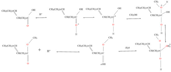 In the catalyst reaction mechanism of Figure 7, the Salix carboniferous solid acid catalysts provide H+, which formed a monomolecular carbocation with the oxygen on the carbonyl group in the oleic acid structure. Then the hydroxyl group on the methanol attacks the carbonyl group on the oleic acid to form a nucleophilic addition reaction. The intermediate is obtained, which is extremely unstable. After reversible rearrangement, the water molecule is lost as a leaving group, and finally methyl oleate is formed.