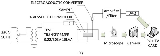 As regards measurement time, the studied sample was placed in a methyl polymethacrylate vessel filled with electrical insulating oil. The voltage between the electrodes during the tests ranged from a few to several kV. The AE signals were measured by means of a Physical Acoustic Corporation (PAC) R3α electroacoustic converter and a filtering and amplifying system composed of 2/4/6 type pre-amplifier from PAC, a 20 ÷ 1000 kHz transmission band filter, and PAC AE5A amplifier. Upon amplification, the signal was recorded in the computer memory with an data acquisition (DAQ) NI–USB6251 card, which enabled signal recording with a sampling frequency up to 1 MS/s and 16-bit resolution. The test setup schema, the view of the measuring equipment, and the view a sample holder are presented respectively in Figure 1a–c.