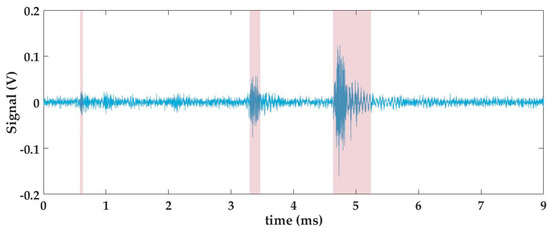In order to obtain training information y, which belongs to the set {0,1}, the recorded signal was blasted using the wavelet decomposition with the fifth-order Daubechies wave. Then, using the method of exceeding the trigger threshold, which was set at 20 mV for the presented problem, the information value y was allocated for each training set: 0 for no acoustic emission and 1 for the acoustic emission event (these are the red areas in Figure 2). Figure 2 presents one signal fragment with the sampling frequency of 1 MS/s selected for further studies. The red areas mark acoustic emission events determined on the basis of threshold crossing.