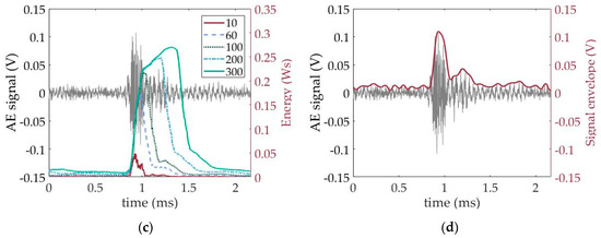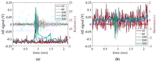 In order to identify the aforementioned relationships, window lengths of 10, 60, 200, and 300 samples were used. The windows were applied to a signal containing a single acoustic emission and moved by one sample (the window position against the AE signal was changed this way). A dataset was calculated for each position of the window. Figure 4 presents the values of each teaching feature as a function of the window position, at different window lengths, against the AE signal: kurtosis (a), skewness (b), and energy (c) respectively. Moreover, Figure 4c presents the identified upper envelope of the sample signal.