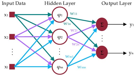 A radial basis functions (RBF) network, similar to FNN, is a network with an oriented flow of signals. The network neurons have a radial activation function φ. The neuron output y is described by the relationship [40]: