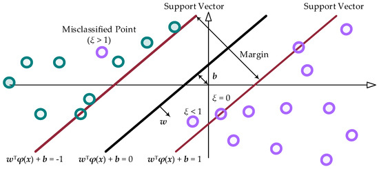 A support vector machine (SVM) was another network used in the studies. The purpose of the SVM network operation is to use a hyperplane spread in the hyperspace of the input parameters, which separates a collection of points (sets of input parameters) belonging to two different classes, with a certain error margin.